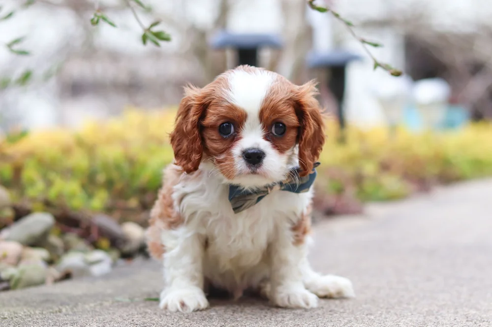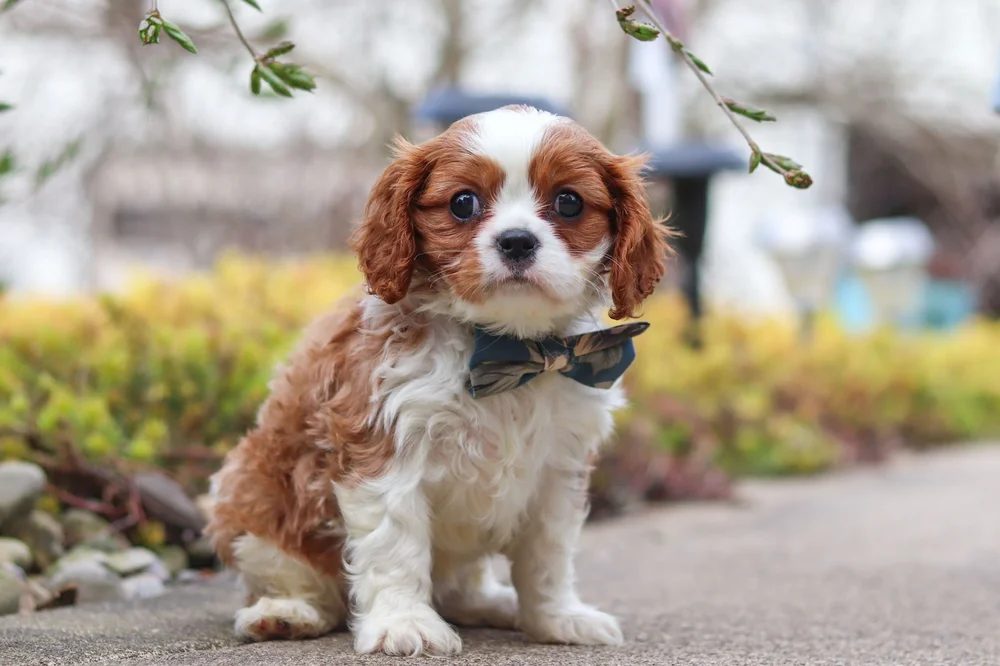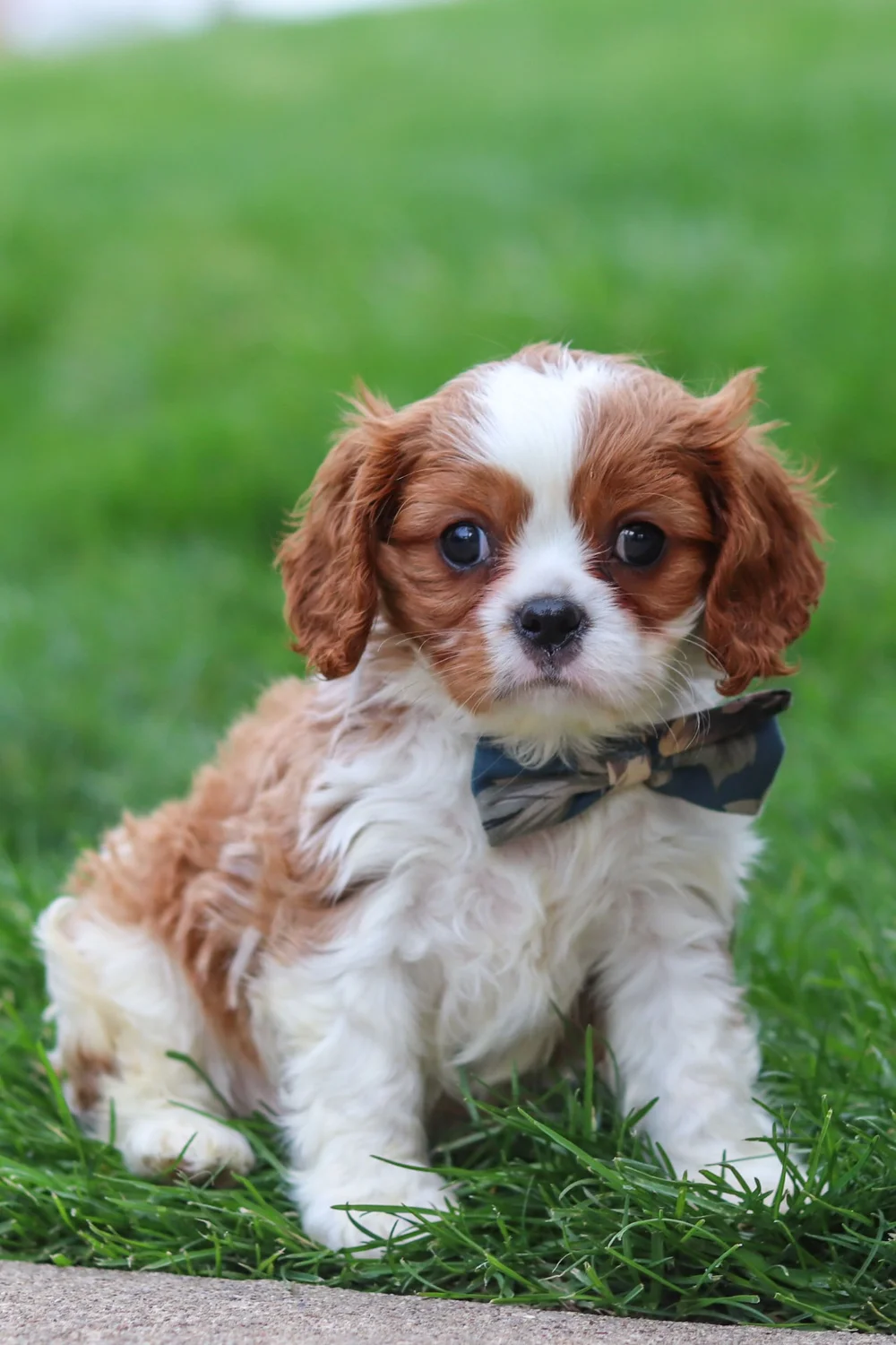 he is a breathtaking Blenheim Cavalier with rich chestnut markings laid over a soft, snowy white coat—his colors alone are enough to stop you in your tracks. Add in those gentle eyes and that fluffy, wavy coat, and you have a puppy that feels like pure comfort.