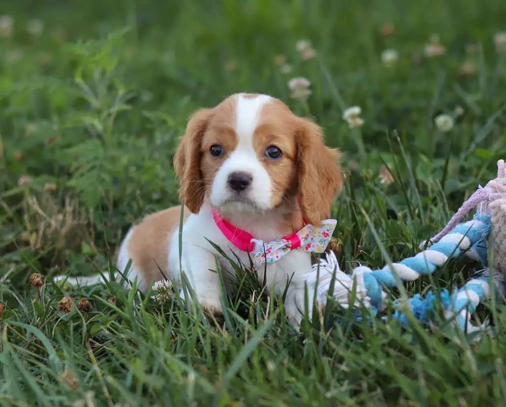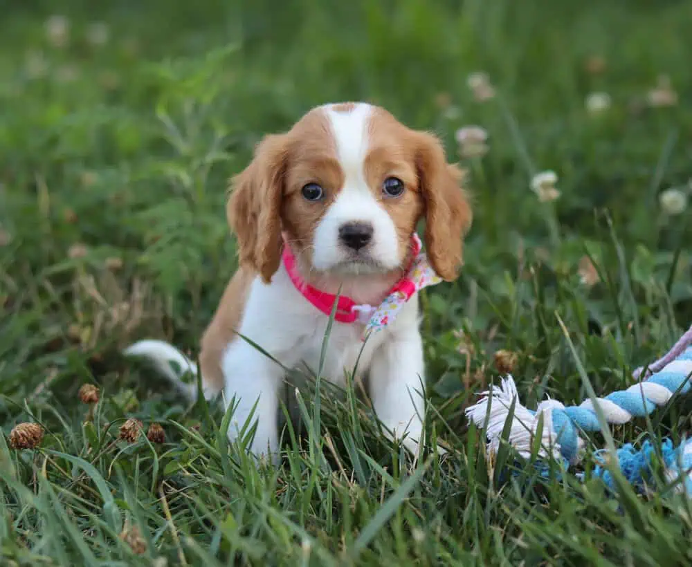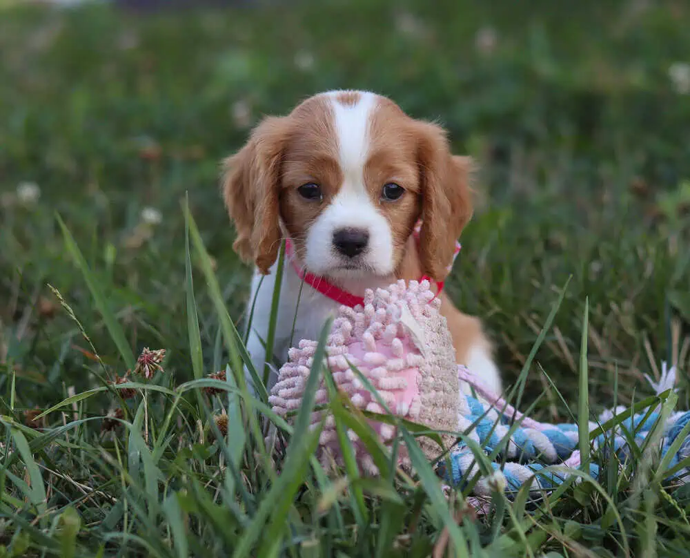 Lilac is a Blenheim-colored Cavalier puppy whose gentle nature and loving eyes are impossible to resist. She’s the perfect snuggle buddy, always ready to curl up beside you—or head out on a sunny walk, a road trip, or a weekend getaway.