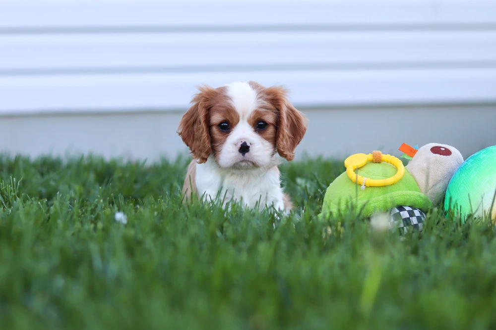 he is a beautiful Blenheim Cavalier with rich chestnut markings and a soft white coat that gives him that classic, timeless charm. With warmer weather and summer days ahead, he’s the perfect companion for evening walks, sunny afternoons, and quiet moments by your side. Omen isn’t just a puppy—he’s the loyal friend who will make this summer one you’ll always remember.