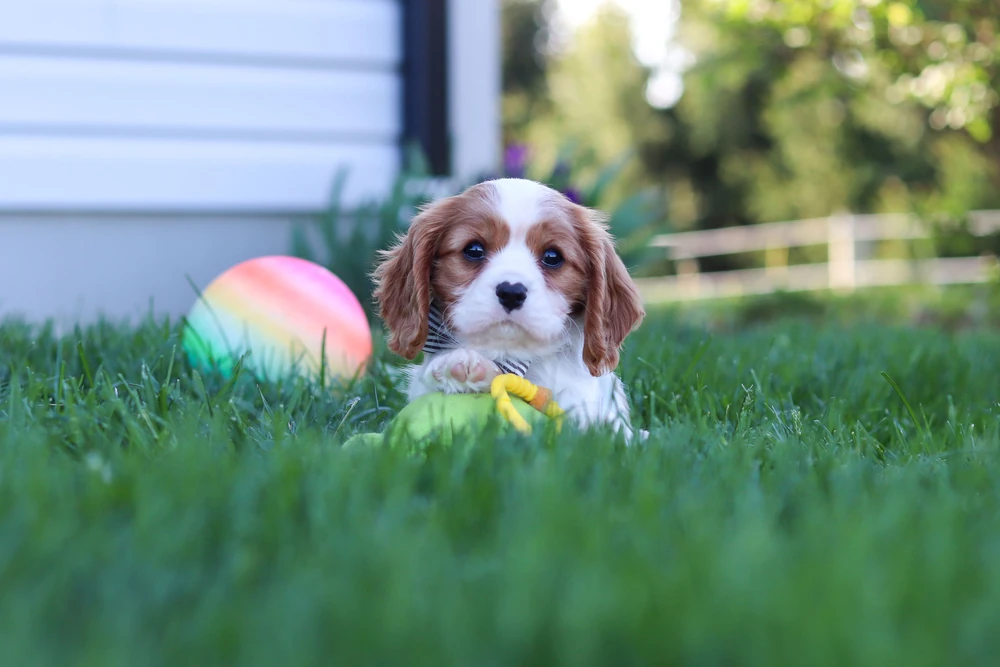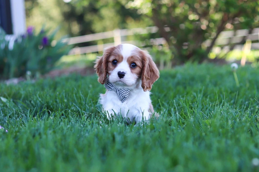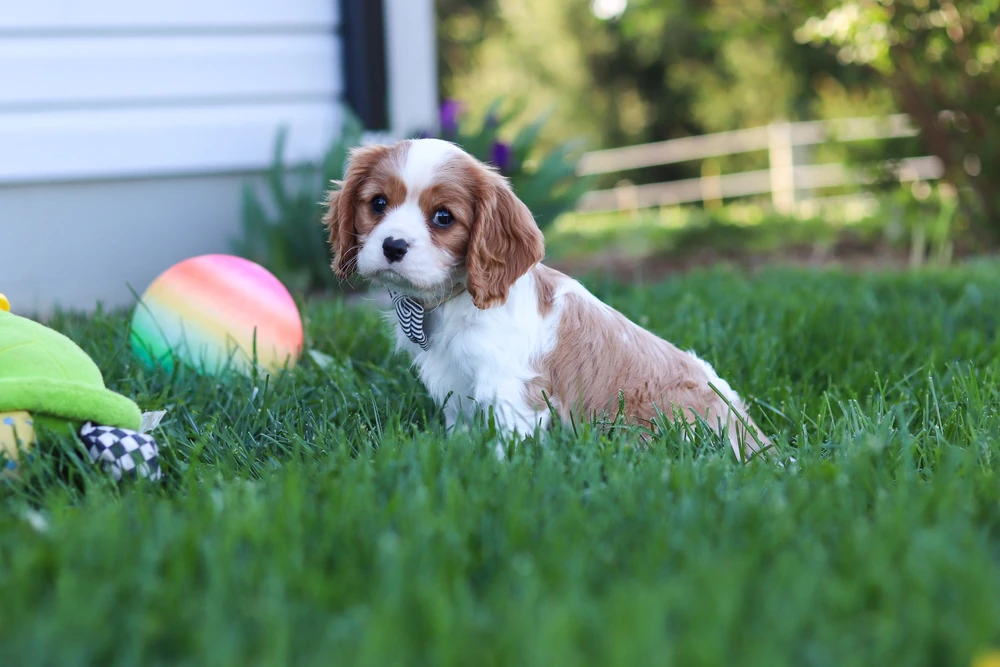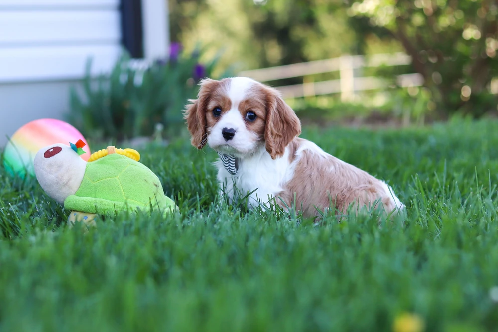 A Blenheim colored Cavalier female in the lawn.